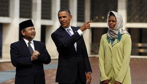 資料圖片:2010年11月10日,在印度尼西亞首都雅加達,美國總統奧巴馬(中)在一位阿訇的陪同下參觀一座清真寺。