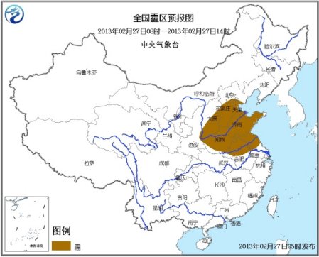 27日,中國中東部大部分地區將有霧霾天氣,其中,黃淮中東部、江淮東部、華北中東部、河南北部、湖北中部等地的部分地區有能見度不足1000米的霧,華北中南部、黃淮大部、江淮中北部等地有霾。