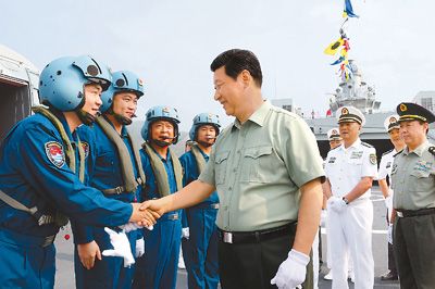 中共中央總書記、國家主席、中央軍委主席習近平在出席博鰲亞洲論壇2013年年會相關活動后,專程來到海軍駐三亞部隊,代表黨中央、中央軍委向官兵們致以誠摯的問候,勉勵大家深入抓好黨的十八大精神學習貫徹,牢記黨在新形勢下的強軍目標,堅定強軍信心,獻身強軍實踐。這是4月9日,習近平在井岡山艦上與艦載直升機飛行員親切握手。