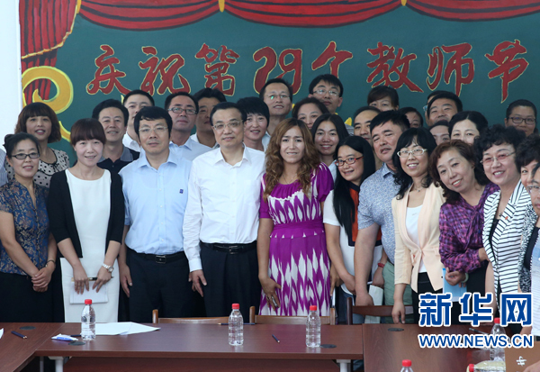 在學(xué)校會(huì)議室,李克強(qiáng)同教師代表座談。他說,明天是你們的節(jié)日,我代表黨中央、國務(wù)院向在座各位并向全國的教育工作者致以節(jié)日問候,衷心感謝大家為教育事業(yè)付出的辛勞和心血。曾參加援疆援藏支教、從事新疆班教學(xué)和從貴州、新疆等地來進(jìn)修的老師們爭相發(fā)言,談了體會(huì)和感受。援藏的老師還給總理送上一張反映支教生活的光盤,李克強(qiáng)愉快地收下,并表示會(huì)好好看。他說,你們懷著一顆熱愛教育的心,為邊遠(yuǎn)貧困地區(qū)孩子帶去知識(shí)和希望,匯聚起促進(jìn)教育公平的積極力量。要鼓勵(lì)更多人才到西部支教,讓更多西部教師到東部培訓(xùn),這不僅可以提高西部教育水平,更是揚(yáng)起了一面旗幟,放飛了希望,讓貧困地區(qū)的孩子感到有前途、有奔頭。