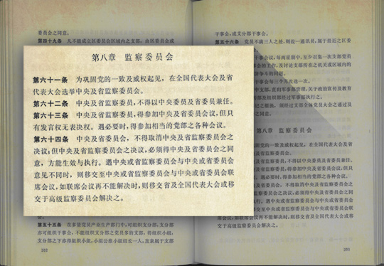 新修訂的黨章中專門(mén)增設(shè)了“黨的監(jiān)察委員會(huì)”一章,對(duì)中央和省監(jiān)察委員會(huì)產(chǎn)生的方式、職責(zé)權(quán)限范圍以及工作運(yùn)行機(jī)制都作了詳細(xì)的規(guī)定。黨章規(guī)定:“為鞏固黨的一致及權(quán)威起見(jiàn),在全國(guó)代表大會(huì)及省代表大會(huì)選舉中央及省監(jiān)察委員會(huì)”,黨的全國(guó)代表大會(huì)還負(fù)責(zé)討論和批準(zhǔn)中央監(jiān)察委員會(huì)的報(bào)告、人數(shù)、改選等工作,“中央及省監(jiān)察委員,不得以中央委員及省委員兼任”。