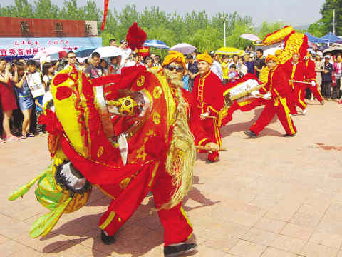 在上午的開幕式上,一條長30米左右的龍燈時而蜿蜒盤旋、時而上下翻滾;兩對獅子調皮地眨著眼睛,戲動彩球,逗人捧腹。威風鑼鼓表演動作整齊、鼓點渾厚、令人振奮,展現出宜秀人民奮發有為積極進取的精神風貌和追趕跨越率先崛起的豪邁氣概。宜秀區文廣新局還結合非物質文化遺產宣傳日活動,通過生動形象的展板把“五橫水餃”等10個錄入市區級非物質文化遺產名錄的非遺品種栩栩如生地再現出來,讓人耳目一新。黃梅村是黃梅戲藝術大師嚴鳳英的故鄉。黃梅鄉音耳熟能詳。開幕式上,還表演了經典黃梅戲唱段和黃梅歌舞。“鬧花燈”詼諧幽默,“打豬草”反映淳樸民風,“到底人間歡樂多”唱出對美好生活的憧憬。黃梅歌舞“山野吹來的風”清新又奔放,把現場氣氛推向高潮。