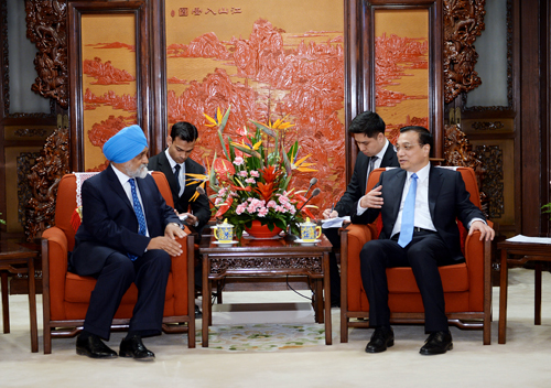 國(guó)務(wù)院總理李克強(qiáng)19日下午在中南海紫光閣會(huì)見(jiàn)來(lái)華出席第三次中印戰(zhàn)略經(jīng)濟(jì)對(duì)話的印方主席阿魯瓦利亞。