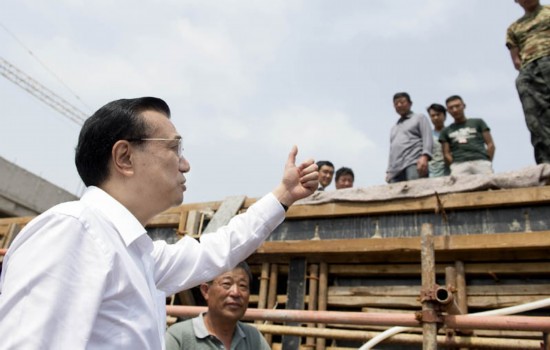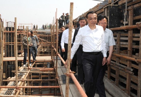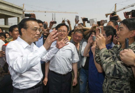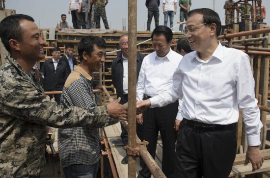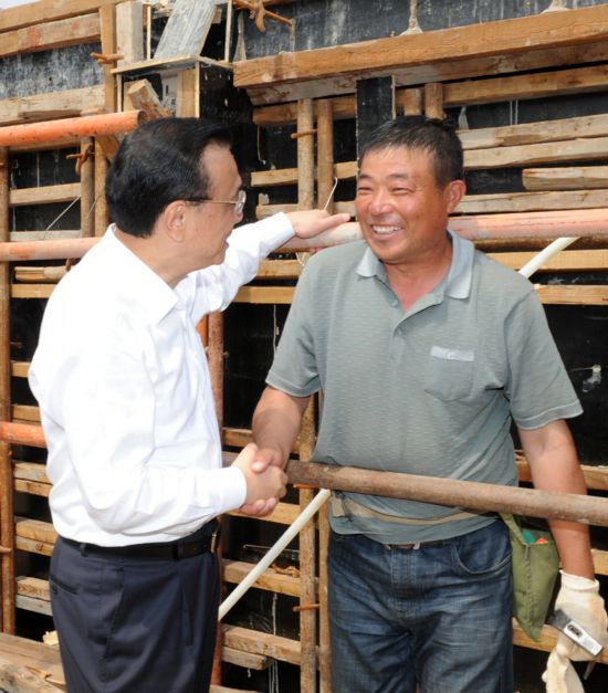 22日,在赤峰污水處理項目工地,李克強走上腳手架與農民工交談。他說,你們為城市地上工程貢獻了力量,現在又做地下工程,為長久發展打基礎,你們是城市建設的雙功臣。城市地下設施歷史欠賬多,未來要做更多地下工程,你們把這方面的技術學好,將來會有更多活干!
