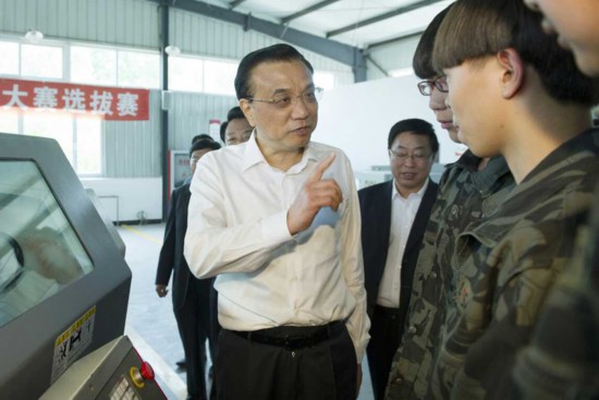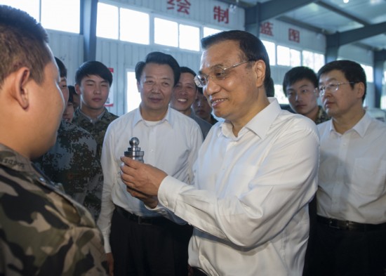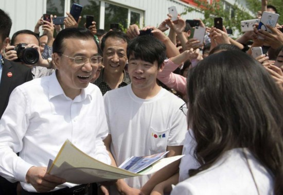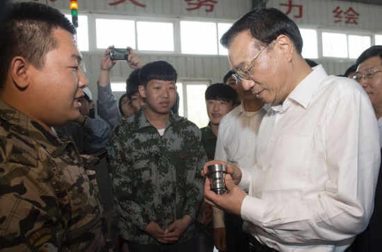 22日在赤峰市工業職業技術學院,桑力猛同學將參加技能大賽的獲獎零件作品送給總理。李克強仔細端詳,稱贊“接近完美”,表示要擺在自己辦公室。總理對現場學生說,技不壓身,學好技術,就有了走遍天下都不怕的本事,這是一輩子都打不破的鐵飯碗。