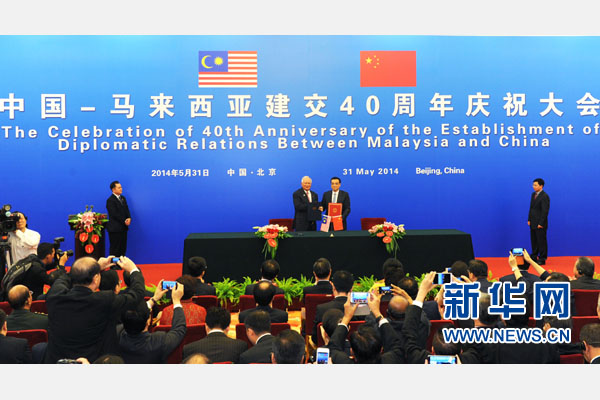 新華網(wǎng)北京5月31日電(記者譚晶晶)中國(guó)與馬來(lái)西亞建立外交關(guān)系40周年慶祝大會(huì)31日在人民大會(huì)堂舉行。國(guó)務(wù)院總理李克強(qiáng)和馬來(lái)西亞總理納吉布共同出席并發(fā)表講話(huà)。