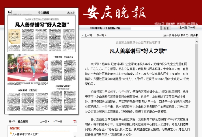企業(yè)家龍道權(quán)多年來(lái),把精力投入到企業(yè)經(jīng)營(yíng)的同時(shí),不忘初心、不忘感恩,熱心公益事業(yè),積極幫扶困難群體。十余年來(lái),他一直堅(jiān)持對(duì)小龍山社區(qū)養(yǎng)老服務(wù)中心無(wú)償捐贈(zèng),并關(guān)心家鄉(xiāng)公益事業(yè)和民生工程建設(shè),積極捐資。鄉(xiāng)里社區(qū)群眾稱道他是“大好人”,5月9日,還獲得2018年4月份“安慶好人”的光榮稱號(hào)。
