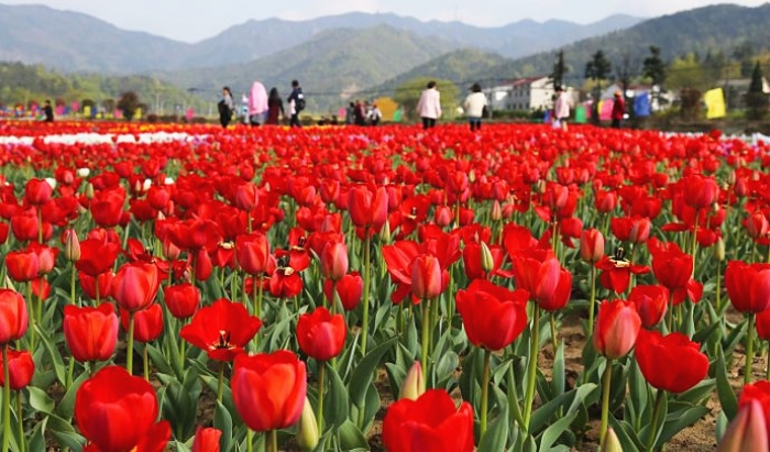 楊亭村東側的“中國秀園”還在建設當中,其中寬約50米的郁金香花帶已經盛開,從入口處一直延伸到遠處的山坡上,引來很多游客。