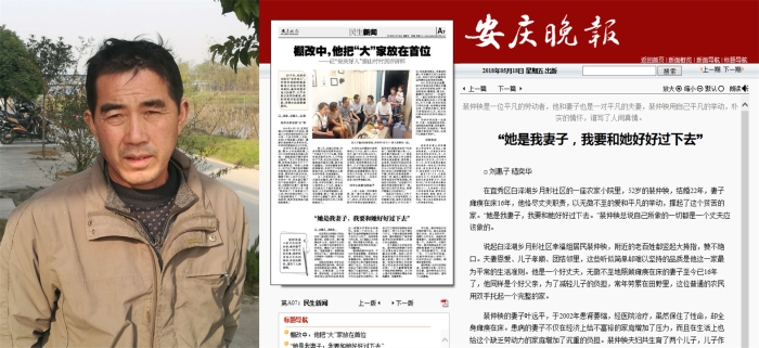 在宜秀區(qū)白澤湖鄉(xiāng)月形社區(qū)的一座農(nóng)家小院里,52歲的裴仲秧,結(jié)婚22年,妻子癱瘓?jiān)诖?6年,他恪盡丈夫職責(zé),以無微不至的愛和平凡的舉動(dòng),撐起了這個(gè)貧苦的家。“她是我妻子,我要和她好好過下去。”裴仲秧總說自己所做的一切都是一個(gè)丈夫應(yīng)該做的。