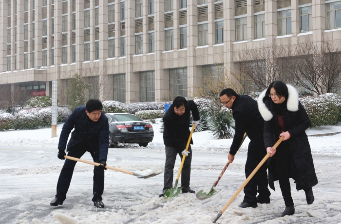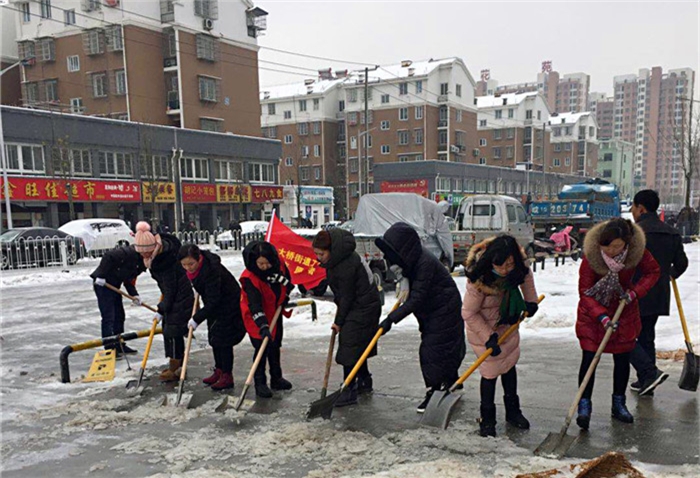 在全區各個責任片區,大家也分工明確,各自拿著掃帚、鐵鍬,對轄區的主要交通道路、坡度較大的地段及不易融化的陰暗地段進行地毯式清掃和鏟雪。行動中,大家鏟的鏟,掃的掃,個個卯足了力氣,忙碌的身影在風雪中構成了一道靚麗的風景線。