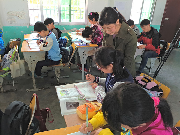 站在講臺上的這位鄉村教師,個子不高偏瘦但腰桿筆直,衣著樸素又不失大方,戴著邊框眼鏡,眼神中充滿了對職業的熱忱,對孩子們的慈愛。授課時,標準的普通話字正腔圓、吐字清晰,話語間的抑揚頓挫、合轍押韻如山間泉水,沁人心脾。談吐間,讓來訪一行人早早褪去了對鄉村教師帶有標簽化的認知。