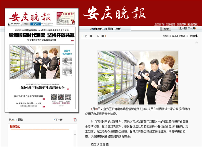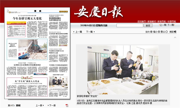 為了應(yīng)對到來的旅游旺季,宜秀區(qū)市場監(jiān)管部門對轄區(qū)內(nèi)的餐飲單位進(jìn)行食品安全專項檢查,重點(diǎn)針對農(nóng)家樂、景區(qū)餐飲店以及校園周邊小餐飲的食品原料采購、加工制作、食品添加劑使用是否規(guī)范,餐具用具是否按規(guī)定進(jìn)行清洗、消毒等進(jìn)行檢查,以保障市民旅游期間的飲食安全。