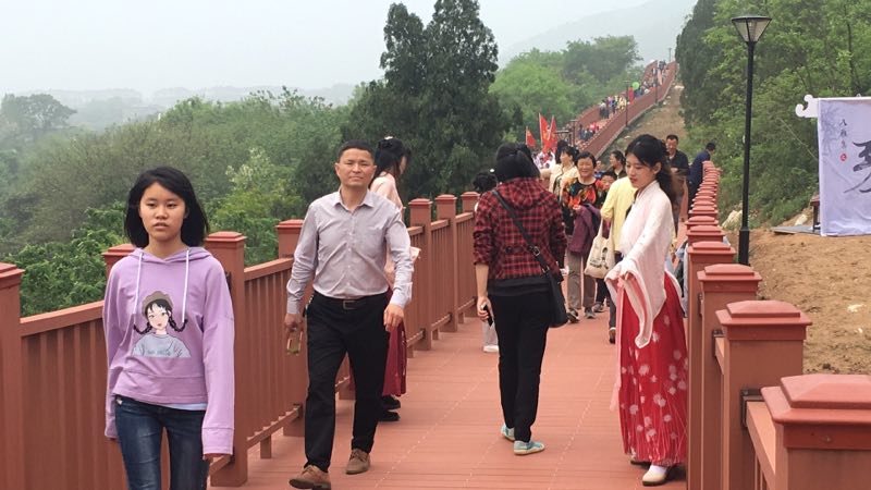 與開幕式同步進行的是游千米棧橋、行5公里慢道。市民沿路既可以欣賞新建景點——景觀棧道、林間漫道,也可以親身體驗設多彩多姿的活動項目。身著漢服的演藝人員與慢道融為一體,“八雅”古韻驛站沿途設置,以“琴、棋、書、畫、詩、酒、花、茶”為主題,各具特色;位于慢道一側的“相親角”人頭攢動,一張張看似占據了很小空間的驛站,吸引了游客駐足觀看游玩打卡,同心鎖留下親情愛情見證,受到眾多年輕人的追捧,形成了一道亮麗的風景。