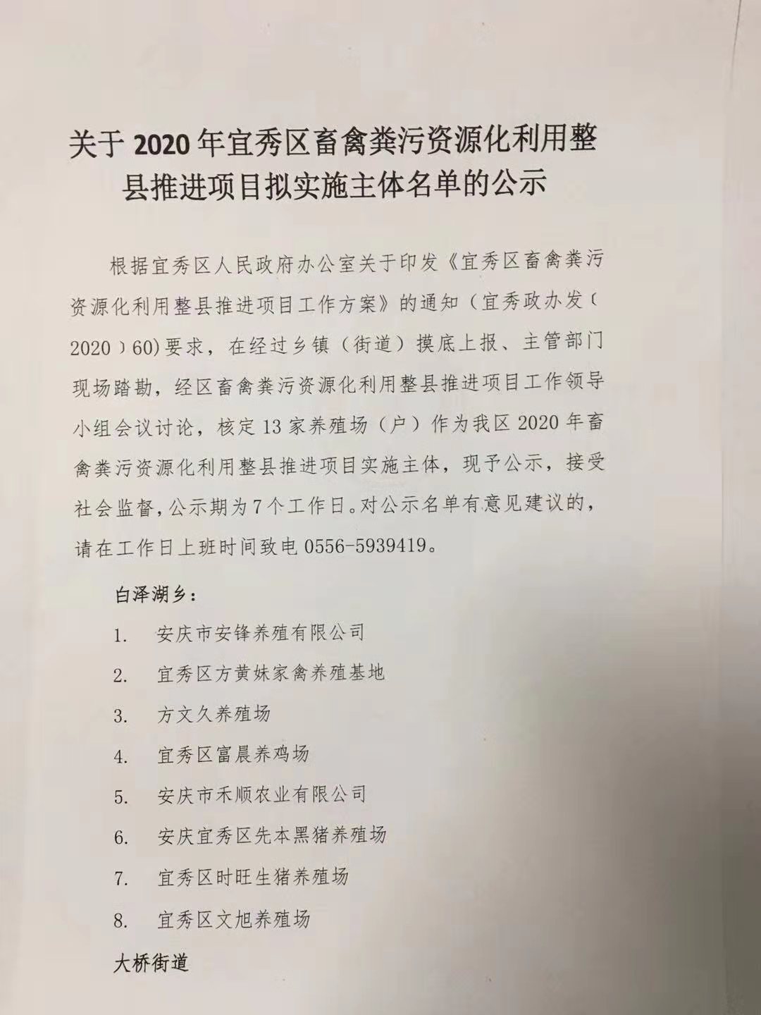根據宜秀區人民政府辦公室關于印發《宜秀區畜禽糞污資源化利用整縣推進項目工作方案》的通知(宜秀政辦發﹝2020﹞60)要求,在經過鄉鎮(街道)摸底上報、主管部門現場踏勘,經區畜禽糞污資源化利用整縣推進項目工作領導小組會議討論,核定13家養殖場(戶)作為我區2020年畜禽糞污資源化利用整縣推進項目實施主體,現予公示,接受社會監督,公示期為7個工作日。對公示名單有意見建議的,請在工作日上班時間致電0556-5939419。