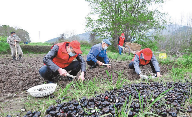 圖為在江成林家的荸薺地,駐村扶貧工作隊和村扶貧干部正在幫忙采挖荸薺。(黃有安 杭文媛 攝)
