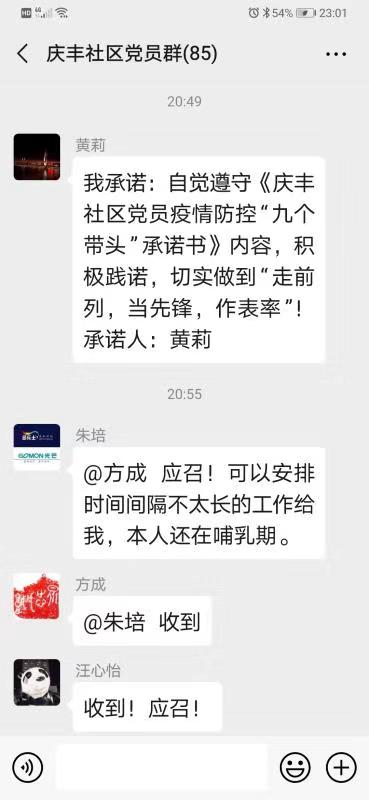 隨后,群里發(fā)布了黨員志愿者一線(xiàn)防控疫情召集令,“應(yīng)召!可以安排時(shí)間間隔不太長(zhǎng)的工作給我,本人還在哺乳期。”這是第一個(gè)報(bào)名的黨員——朱培,一個(gè)家住十里開(kāi)外、懷抱著嗷嗷待哺嬰兒的女黨員。