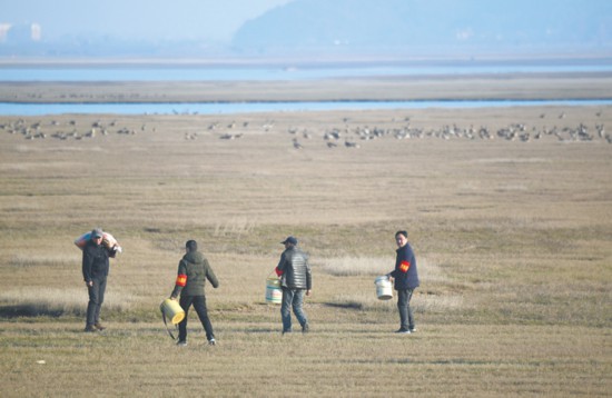受夏季汛情影響,菜子湖濕地候鳥食物減少,保護中心工作人員及時投食,緩解候鳥覓食難的狀況。