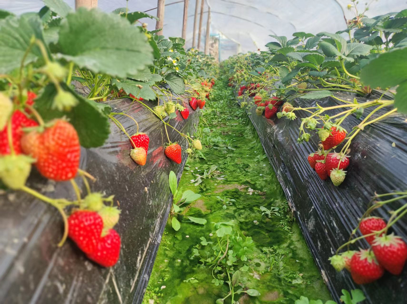 桃梨園不遠處就是規模化的草莓種植采摘基地,顆顆通紅誘人的草莓掛在田壟上,基地的工人們正忙著采摘、分裝草莓,前來采摘的顧客穿梭其間,一派豐收景象躍然眼前。該園內種植草莓50多畝,畝產效益2萬元以上。草莓園吸納了不少村民前來打工,最多時每天務工人員40余人,為附近村民提供了就業崗位。總鋪社區水果產業的發展為鄉村振興注入了強勁動力,隨處可見的果園更承載著村民的“鄉村振興夢”。