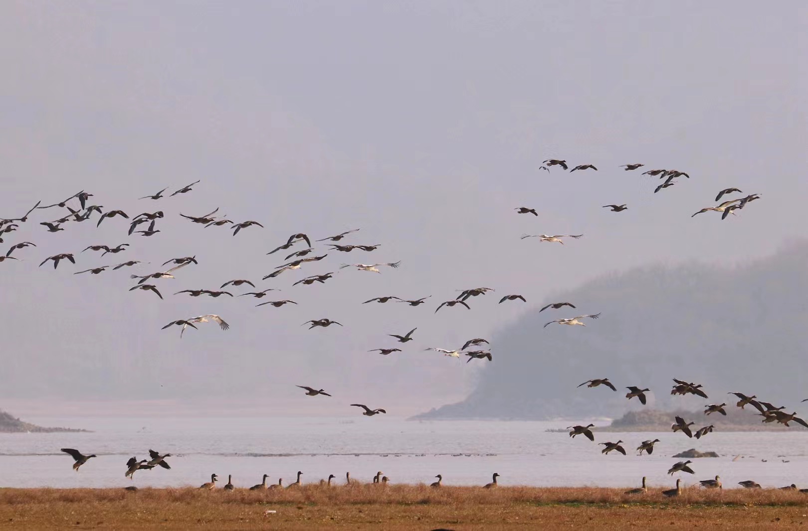 大批北遷白鶴集結菜子湖濕地
