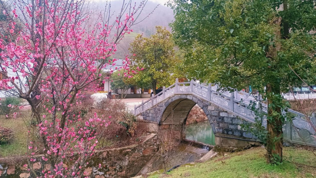 “疏影橫斜水清淺,暗香浮動月黃昏。”花溪茶谷拱橋前,山梅爭相開放,細長的枝椏上,率先掛滿了紅粉色的小燈,串串粉白的花苞,像珍珠似的閃耀。