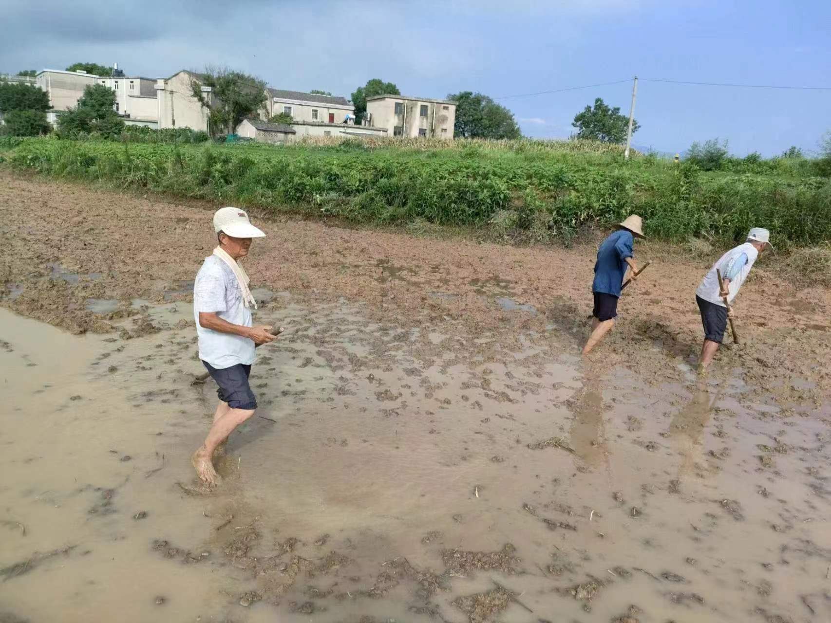 安慶市宜秀區白澤湖鄉先鋒村瓦屋組新開墾的水田里,一行行的水稻長勢良好,綠油油的葉片隨風搖曳,工作人員走進田間,正在查看撂荒地整改種植情況。