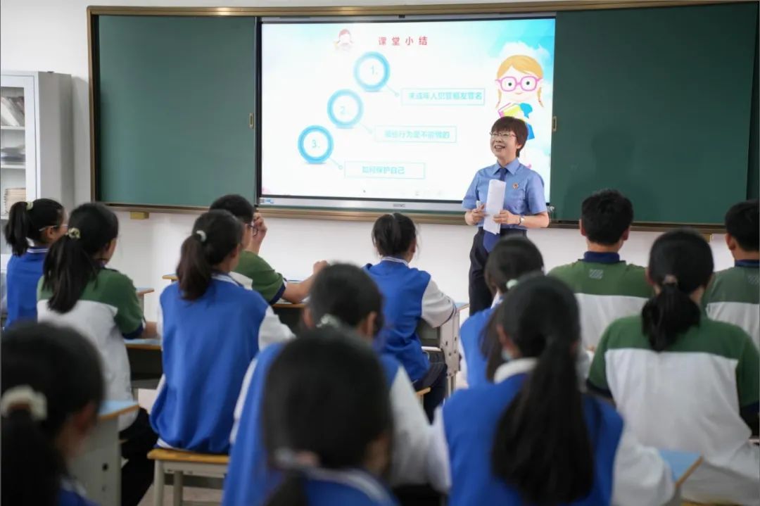 隨后,汪杲檢察長通過讓學生即興演繹的方式,讓同學們身臨其境,沉浸式感受校園霸凌的危害,引導同學們建立健康的社交關系,遠離校園暴力,成為更好的自己。課堂上,未檢干警還向師生們發放了未檢宣傳冊等宣傳資料,普及未成年人檢察工作法律知識。最后,汪杲檢察長以一首關于青春的小詩為結語,鼓勵同學們以青春之名,鑄奮斗底色。