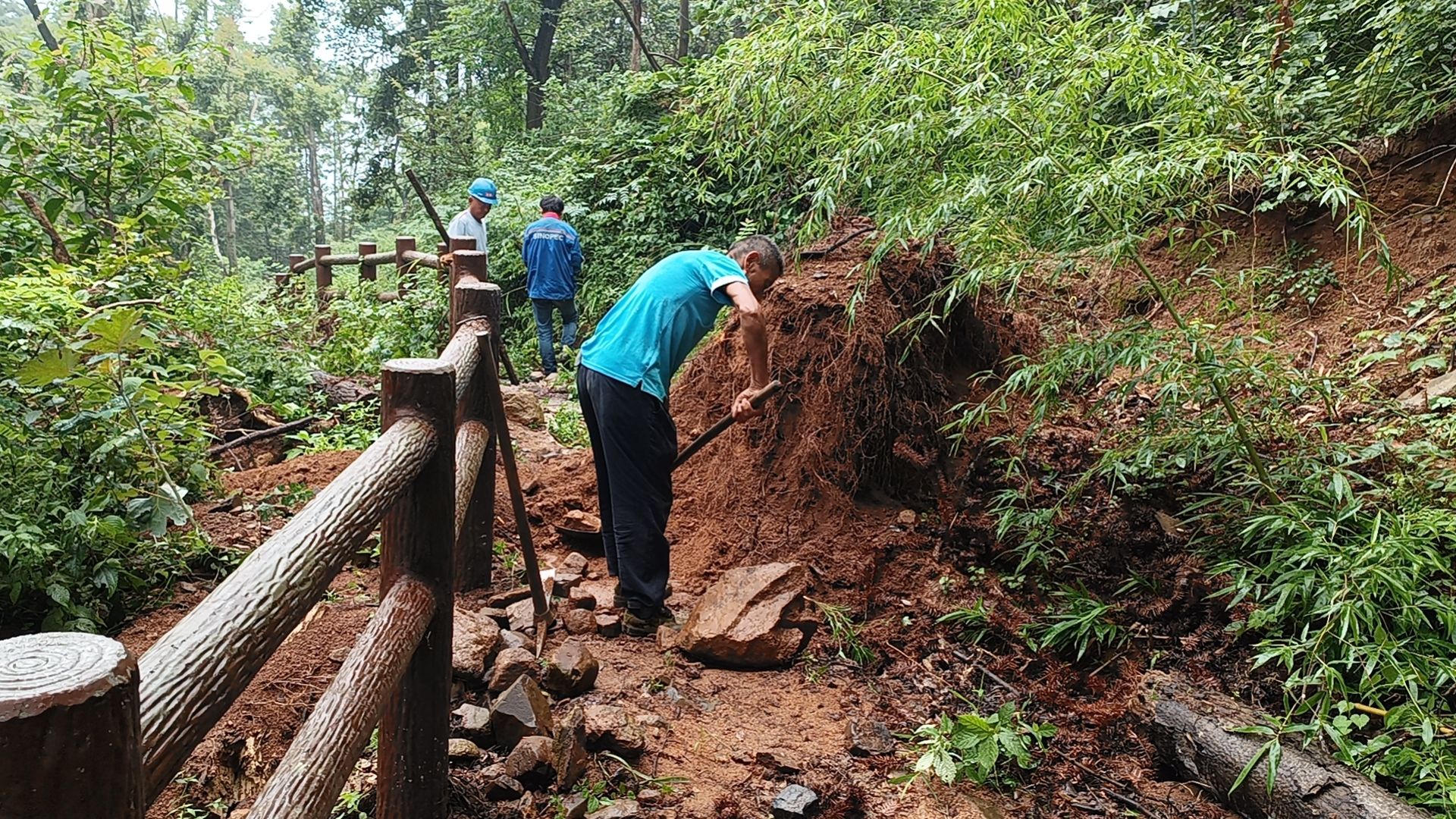 在修復(fù)的過程中,施工方對景區(qū)受災(zāi)區(qū)域進(jìn)行清淤、消殺,修繕以龍湫池景區(qū)為中心點(diǎn)向周邊擴(kuò)散的約為3.4公里的環(huán)山型道路為目標(biāo),優(yōu)化整合、綠色生態(tài)為理念,加大人力、物資、機(jī)械等項(xiàng)目建設(shè)要素投入,按先急后緩的原則逐步進(jìn)行維修,完成水毀平整和欄桿更換,并對原有步道進(jìn)行改造升級,全力以赴加快修復(fù)工作進(jìn)度。同時(shí),社區(qū)為確保工程按時(shí)完工,多次召開調(diào)度會,要求監(jiān)理單位對每個(gè)施工環(huán)節(jié)進(jìn)行全程監(jiān)督,督促施工單位嚴(yán)格按照圖紙施工,確保龍湫池景區(qū)修復(fù)項(xiàng)目高標(biāo)準(zhǔn)完工。